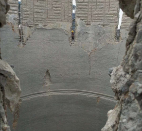 (3)施工人員立在腳手架上,安全帶掛在鋼管上后,用風(fēng)鎬、手錘由外向內(nèi)將筒體逐塊拆除,使碴塊全由筒體內(nèi)部落下;