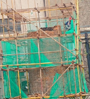鍋爐都拆了,煙囪矗立在這里都好幾年沒(méi)冒煙了,現(xiàn)在煙囪拆除可與周邊小區(qū)美化相協(xié)調(diào),環(huán)境肯定能改善,多好?。 弊≡诮?jīng)三緯九鍋爐房附近的居民徐女士說(shuō)。7日,該處鍋爐廠房?jī)?nèi)45米高的磚煙囪已被綠色的防護(hù)網(wǎng)嚴(yán)密的包裹起來(lái),工作人員正在緊張忙碌地進(jìn)行著拆除作業(yè)。“為防止施工期間碎石、碎磚墜落砸傷過(guò)往行人,我們做了嚴(yán)密的防護(hù)措施,加了腳手架,腳手架內(nèi)外又加了嚴(yán)密的防護(hù)網(wǎng),拆除作業(yè)周邊派專門(mén)的安全員提醒行人和車輛注意安全。